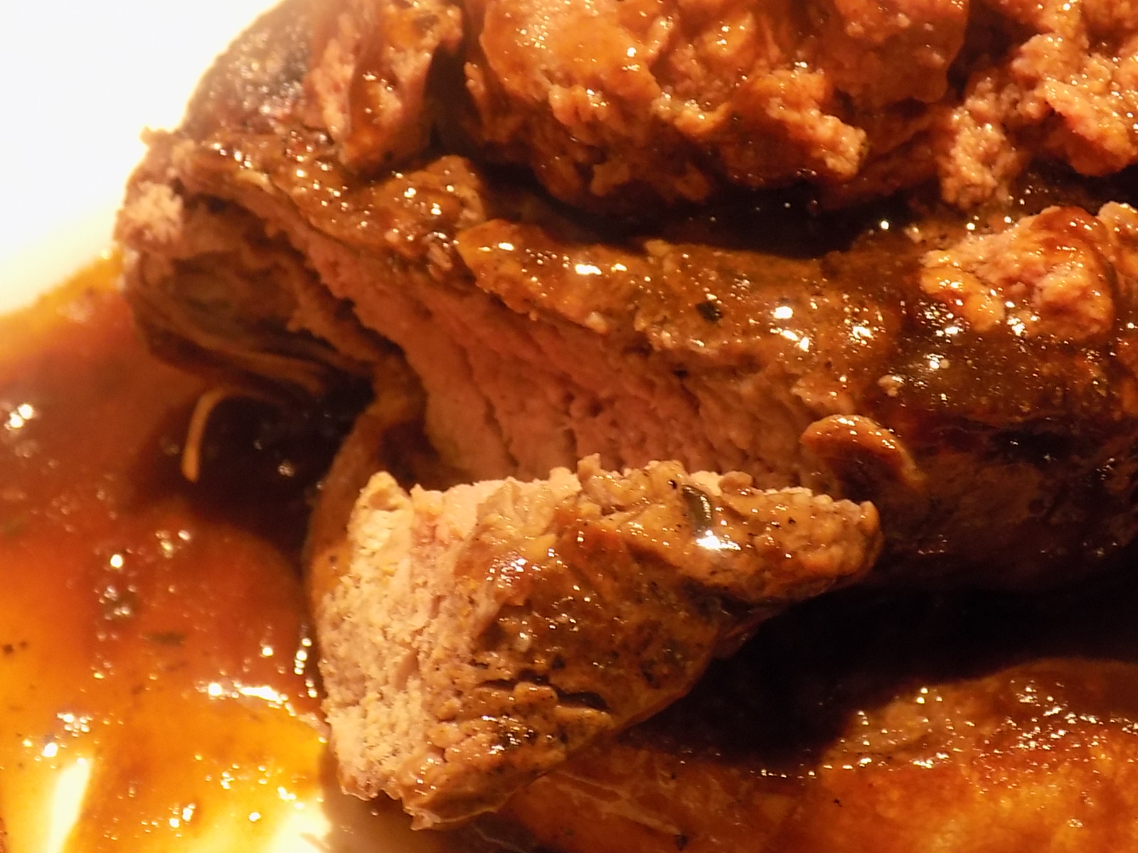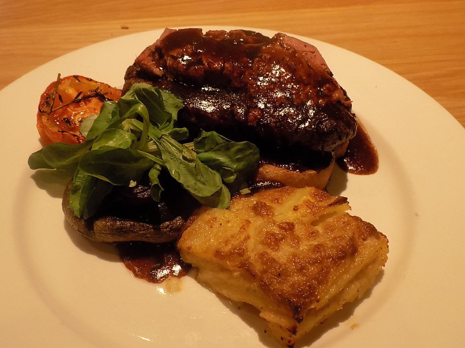 For the main courses there is a turkey option, but we stepped away from it and tried something a little less festive. I went for the 8oz Fillet Steak Rossini which is served on toasted ciabatta and topped with a smooth chicken liver pâté. It was accompanied by dauphinoise potatoes, slow-roasted tomato and mushroom and a beef jus. It was simply delicious, my steak was cooked to perfection, I like it medium, with a pinkish tinge by no blood running. (Have to mention the chef Ant who always cooks the meat so well). The dauphinoise potatoes had a sharp cheesy flavour that was a great contrast to the steak, and I loved the idea of the ciabatta to mop up the delicious beef jus – again a rustic touch but one that really works well.