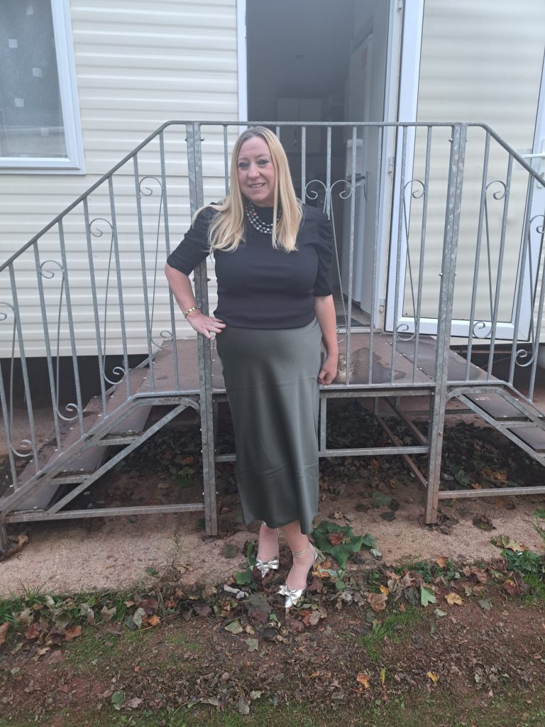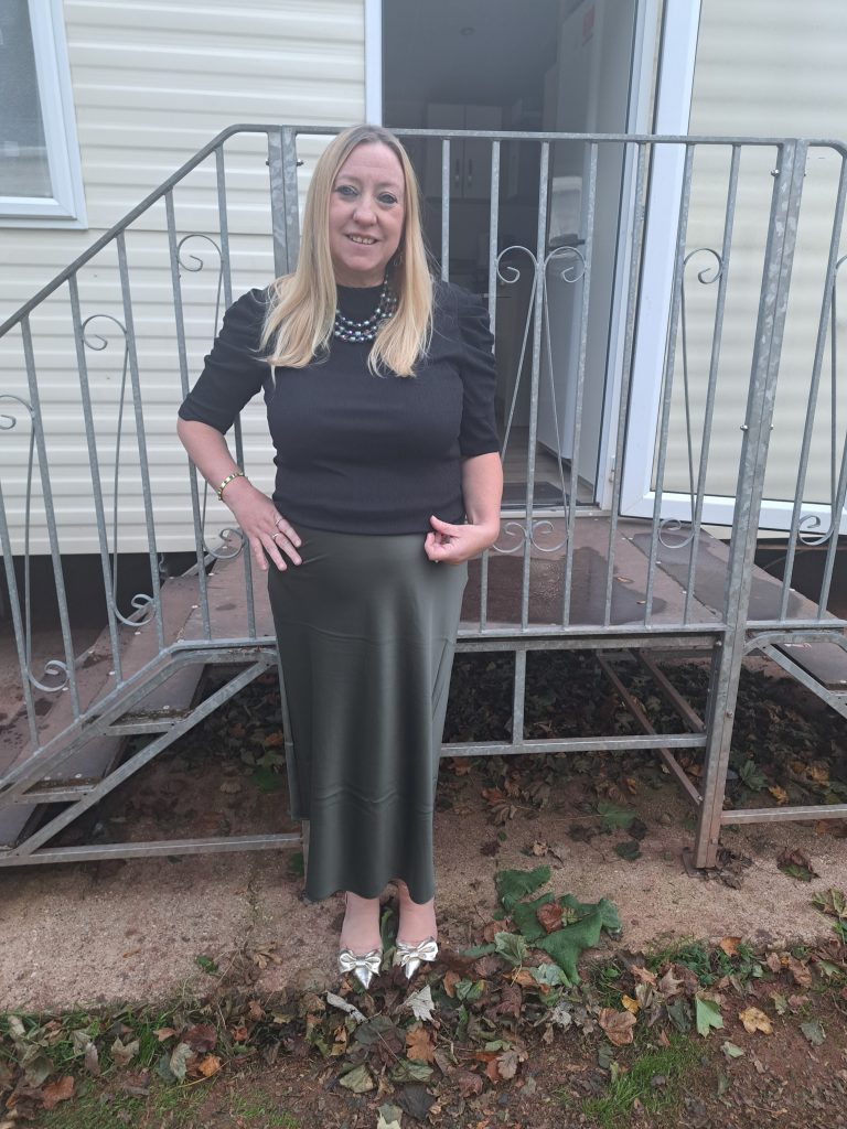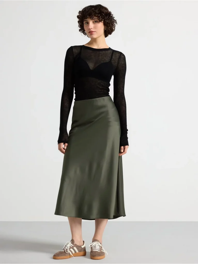 The Lindex Midi skirt in satin comes in three colours, black, brown and dark, dusty khaki. I opted for the khaki version, which I think would go well with creams, black and brown shades, and is a lovely, Autumnal shade. The skirt has a good midi length, landing just below the knee, and has a fully elasticated waistband which makes it comfortable, and makes allowances for those days when you feel the bloat.