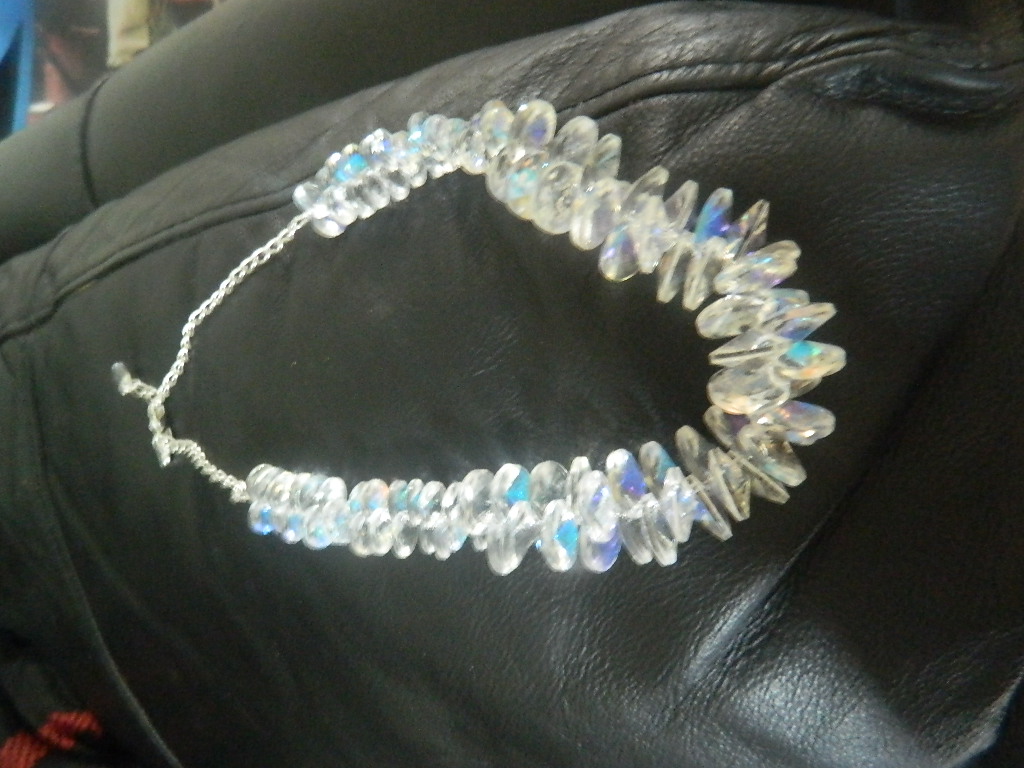 This is a truly lovely piece of jewellery. The necklace is made up of iridescent Swarovski crystals. These are clear, but create the illusion of many different colours when they catch the light – a sort of Aurora Borealis effect . This makes the necklace totally eye-catching and unusual. The necklace is fastened by an adjustable fastener and chain – these are sterling silver, so add another luxurious touch. The chain also has a small crystal at the end, a lovely detail if you are wearing a top with a low or draped back, and also has the small silver Kleshna heart. The necklace has some weight to it, it does feel like a substantial piece of jewellery. However, it is comfortable to wear despite this – I have been wearing this all day to dress up casual wear, as well as for special occasions.