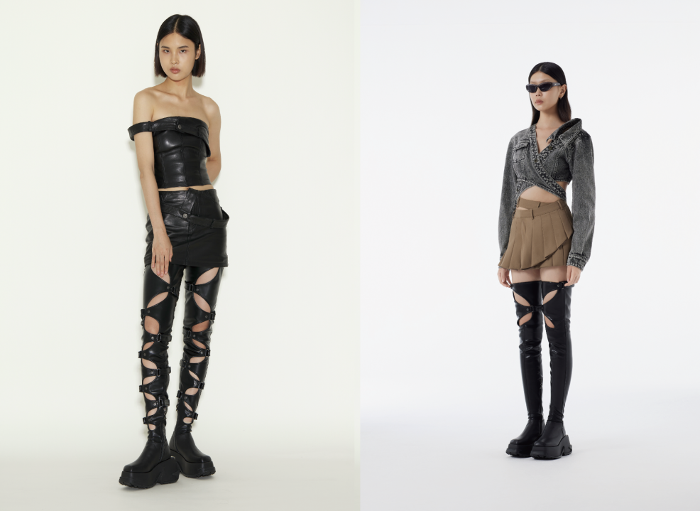 “We expanded the core value of ‘Dare To Be’ of DAPHNE.LAB and merged it with the contradictory aesthetics of MARRKNULL, by deconstructing the silhouette of the SugarCube thigh-high boots and applying ‘infinitely’ extending straps to express the concept of contradictory space. If you look closely, details such as the texture of the leather, the studs on the straps, and the unique finish on the square metal logo of DAPHNE, will bring everything to another level.” said Wang Wei, co-founder and designer of MARRKNULL.
