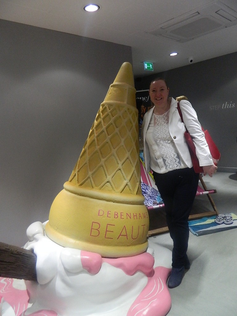 The weather outside was glorious, almost like a summer day, and inside the press office at the Debenhams flagship store on Oxford Street there was a definite flash-forward to holiday season. Candy striped deck chairs sat invitingly (covered with a beach towel of course), whilst a giant ice cream cone attracted lots of attention and made for a perfect photo opportunity. There was a gorgeous barrow with all my favourite pick and mix sweets, and freshly squeezed lemonade and Cranberry juice, ideal for sipping through candy striped straws.