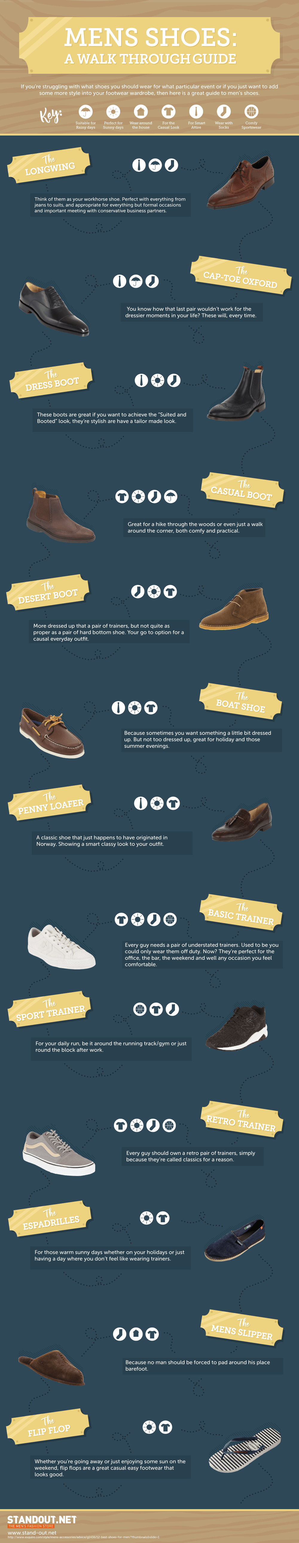 This infographic will walk you through which shoes you should buy next. The Sports Trainer is often in competition with men’s walking shoes as more and more guys want to get into fitness, be it running or walking. It also goes through shoes such the dress boot, the boat shoe and the basic trainer. What I really love about this infographic is that it introduces some keys, these keys easily show you what each shoe is perfect for. For example, the dress boot is perfect for sunny days, for smart attire and also advises you to wear those certain shoes with socks.