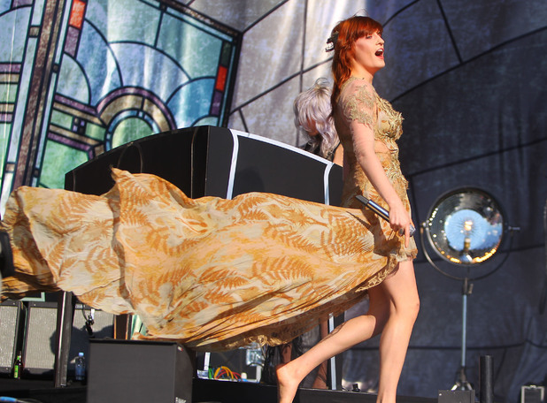 Florence never settles for anything less than spectacular, and this dress, with its extra long train fitted this pattern once again. In antique gold, the colouring suited the singer perfectly, and despite the beauty of the dress, Florence was in hippyish mood with her barefooted look.