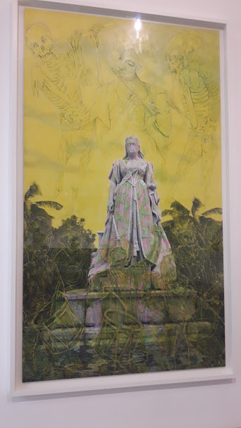 The exhibition is a mixture of photographic images, video installations and sculpture and 3d pieces. The piece that had initially inspired me to want to see the exhibition is Hinterland. Hinterland (2013), is a reworked photograph of a statue of Queen Victoria in Georgetown, Guyana, The statue was removed in 1970 and dumped in the undergrowth of Georgetown’s Botanical Gardens where it decayed, lost a hand, part of its nose, and was generally forgotten and unloved. The statue was rescued in the 1980s and restored to its original setting, but not mended in any way. Hew decorates the image with symbols of Guyana and South America, carnival type figures the echo of Día de Muertos type imagery, and seems to be saying that we should learn from our history, rather than trying to whitewash anything that makes us feel uncomfortable.