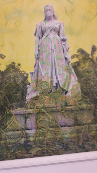 The exhibition is a mixture of photographic images, video installations and sculpture and 3d pieces. The piece that had initially inspired me to want to see the exhibition is Hinterland. Hinterland (2013), is a reworked photograph of a statue of Queen Victoria in Georgetown, Guyana, The statue was removed in 1970 and dumped in the undergrowth of Georgetown’s Botanical Gardens where it decayed, lost a hand, part of its nose, and was generally forgotten and unloved. The statue was rescued in the 1980s and restored to its original setting, but not mended in any way. Hew decorates the image with symbols of Guyana and South America, carnival type figures the echo of Día de Muertos type imagery, and seems to be saying that we should learn from our history, rather than trying to whitewash anything that makes us feel uncomfortable.