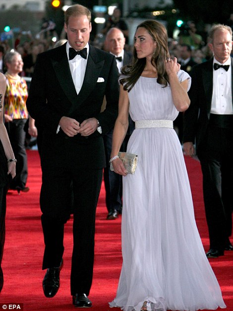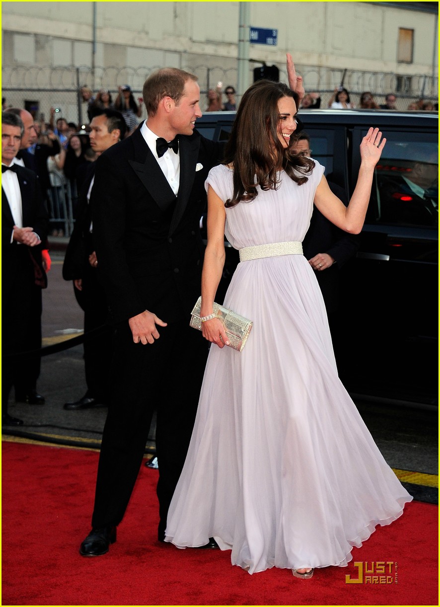 Kate wore a beautiful Grecian style full length dress in lilac, with a silver white cumberband at the waistband. It had a style reminiscent of Fortuny pleats and looked very ethereal and floaty. She accessorised with stunning diamond chandelier earrings that were said to have been borrowed from The Queen, and an amazing (and high!) pair of silver Jimmy Choo vamp sandals and a matching clutch bag.