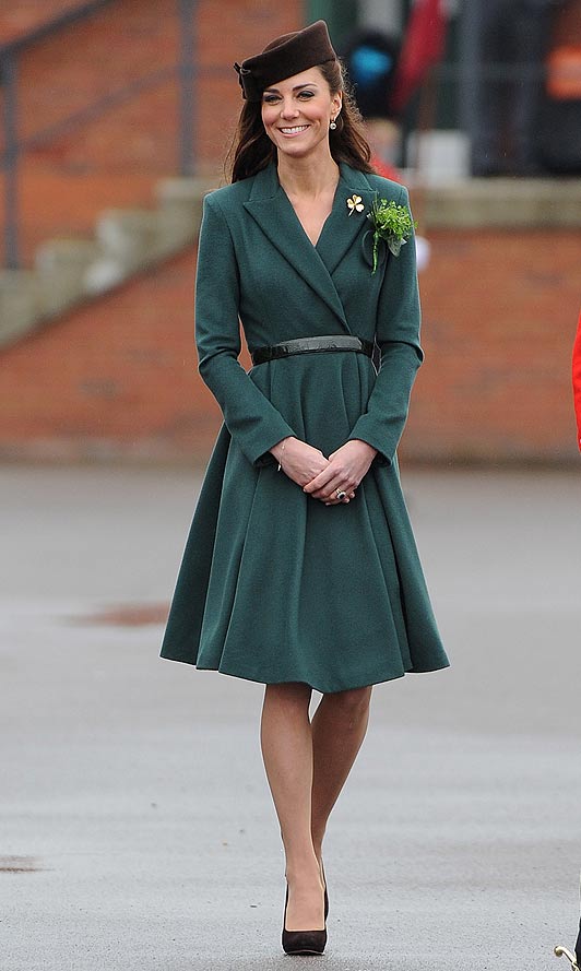 On Saturday Kate paid tribute to the Irish guards by wearing a gorgeous bottle green coat by Emilia Wickstead, along with a small hat from Lock and Co. Again, the silhouette was very similar, waist nipped in with a thin belt, full skirt on the coat, and simple accessories. I loved the shamrock brooch that she wore on her lapel, this once belonged to the Queen Mother.