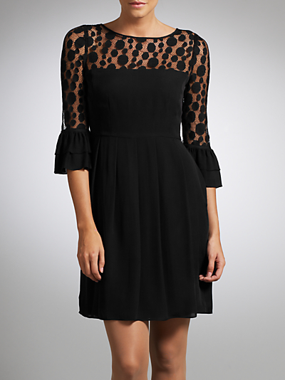 It seems that this dress has been custom made by Alice Temperley for the Duchess, but it contains many of the hallmarks that feature in other Temperley designs, notably the mesh panel and frilled sleeve detail. This can be seen in one of the fab designs Alice produced for her ‘Somerset’ collection for John Lewis, the ‘Spot Mesh’ dress. Another striking point is the use of black and gold as a colourway. With flapper trends and the Great Gatsby on its way, the use of the most Art Deco of colours shows Kate is in tune with style trends once again, but is interpreting them in an elegant and regal way.
