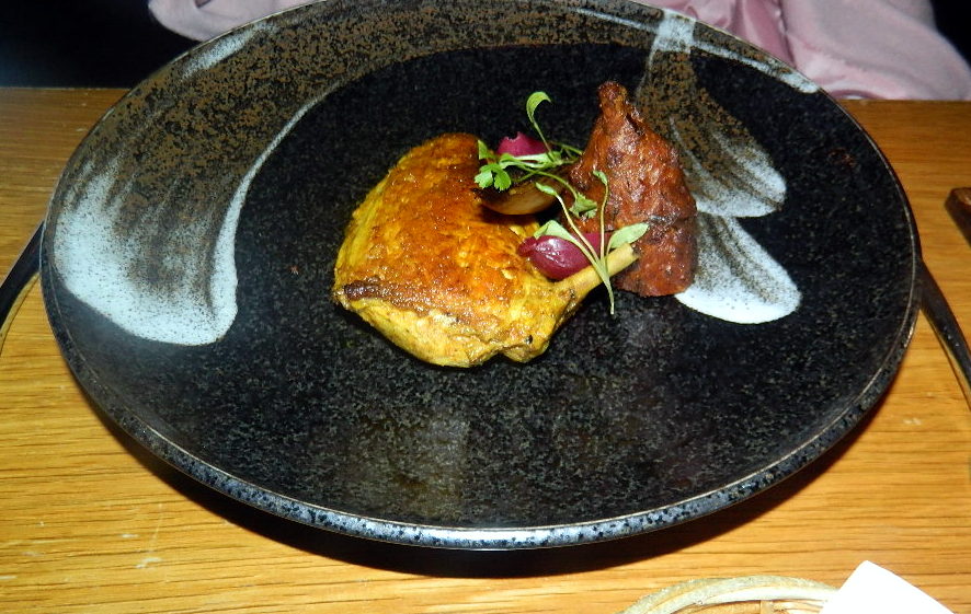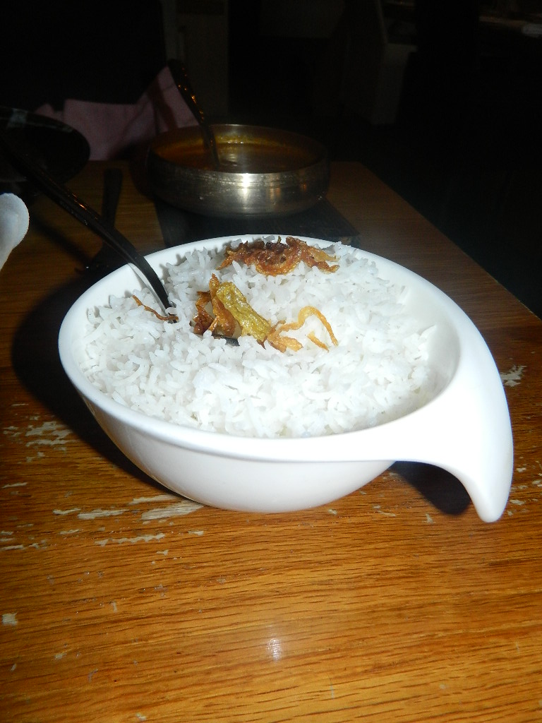 My sister Jodie chose a different chicken dish, the Dopiaza Murgh, which consisted of free range Cotswold white chicken cooked two ways, slow braised leg and roasted supreme marinated in chilli and pomegranate seed. This was s served with caramelised shallots, wilted onion shoots and, most exciting, a classic Kolkata style dopiaza gravy. The presentation was amazing, and the tastes certainly lived up to the appearance, with the chicken soft and tender and packed with flavour, particularly the slow braised leg. The Dopiaza sauce was a delight, with the taste of tomato and onions a real treat for the palette. We’d been advised that one rice would be plenty for two, and this was proved when we couldn’t actually finish it. The term pleasantly stuffed has never been more aptly used.