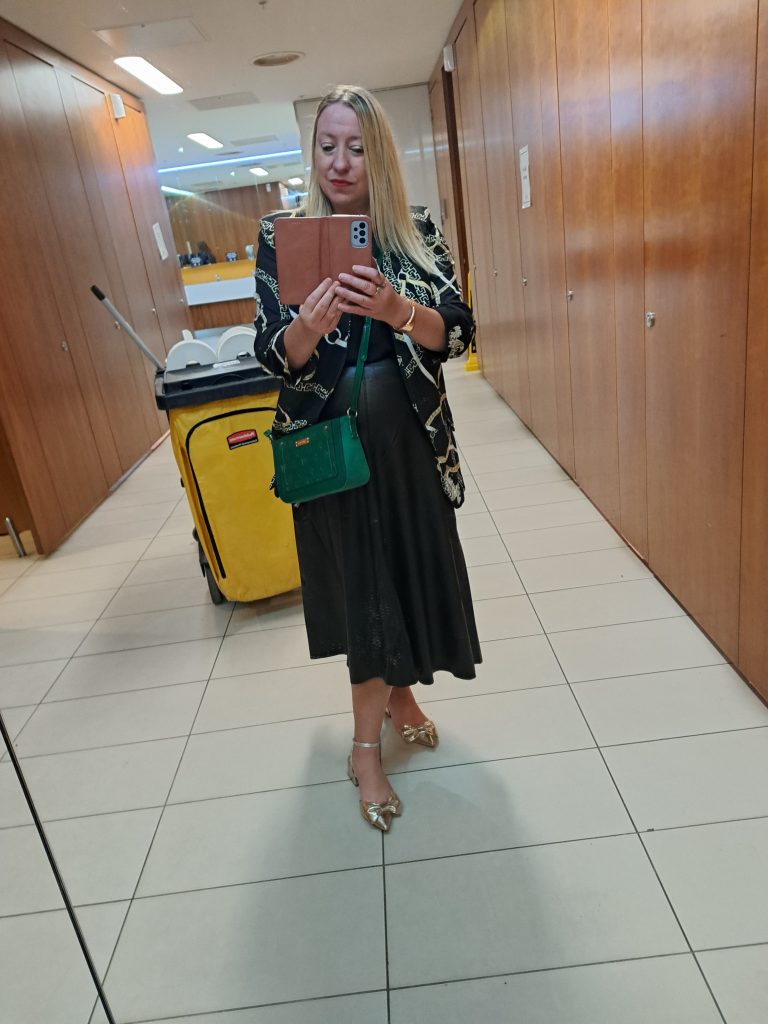 I’ve worn this skirt for a night occasion too, when I went to see the Black Sabbath ballet at the Birmingham Hippodrome, and think it is the perfect evening skirt, smart, but with an edge. On that occasion I teamed it with a vintage blazer, and gold and green accessories, and I think this works well too.