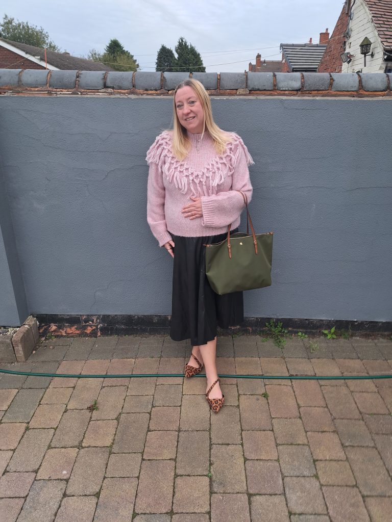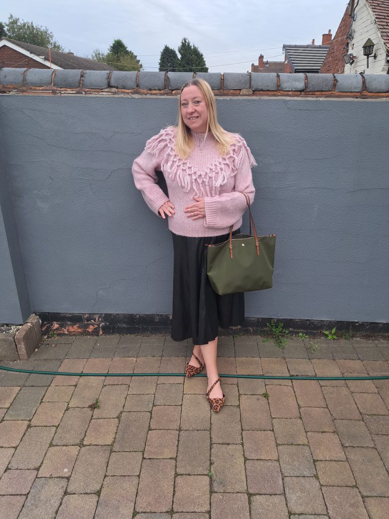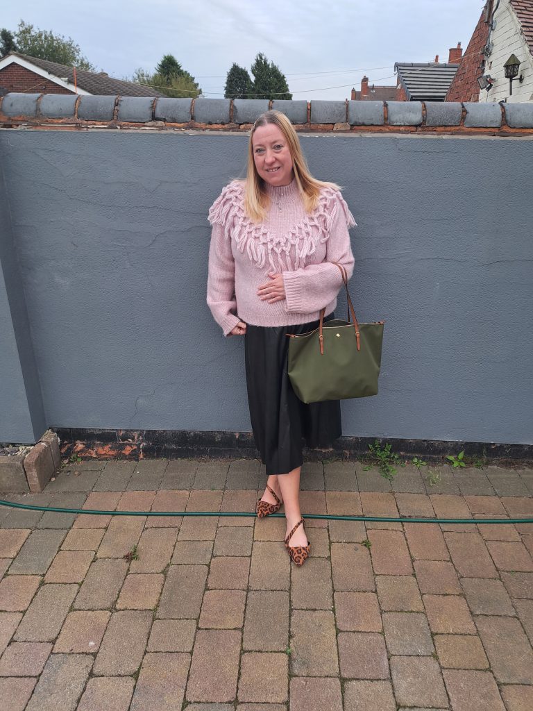 I have teamed it with the jumper for a warm daytime look, and it truly is the perfect Autumn skirt, for although I am wearing it here with flat animal print shoes, it would also work well with boots when the weather turns wintry. As it is black, it would work with pretty much any colour, and I am looking forward to wearing it with a black cashmere polo neck for a classic look.