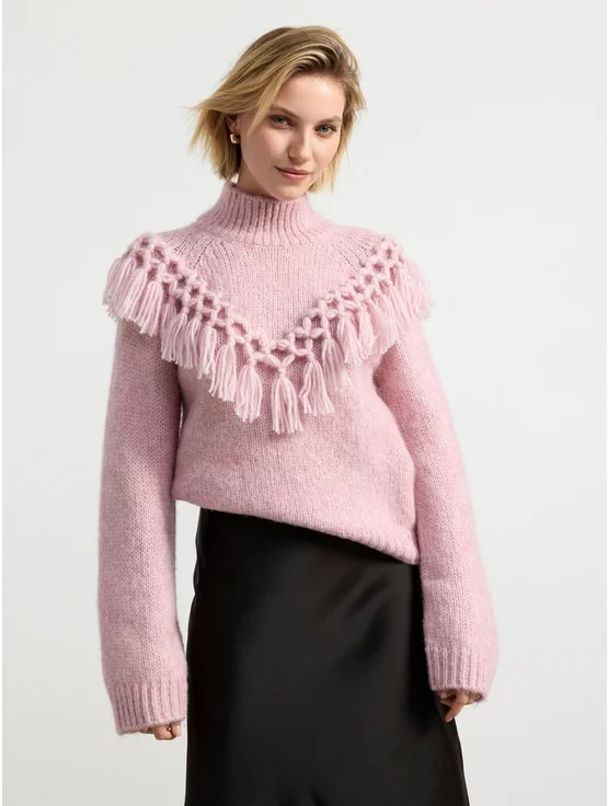 First up is the Mock neck jumper in a stunning light pink shade. This jumper is like wearing a hug, it is so soft, warm and cosy. Made using 60% recycled polyester, the fabric is literally baby soft, and yet unlike many other soft wools, it is not in the slightest bit itchy, which is my total bugbear when it comes to knits. The jumper has a mock neck which is like a low polo, and then has this amazing tassle detail that is just so eye catching and attractive.