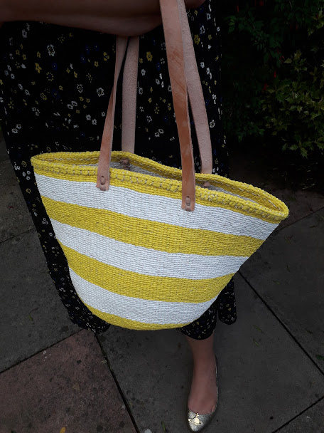 I am in love with Mifuko products. They have stunning style, and are also practical and hardwearing. My bag is the MEDIUM SHOULDER BAG WITH THICK WHITE AND YELLOW STRIPES which retails at 82 euros. It is a medium sized shopping bag with long leather shoulder handles. I love the fact that although it resembles a straw summer bag, it is actually fine on the beach as it can soak up a little bit of water.