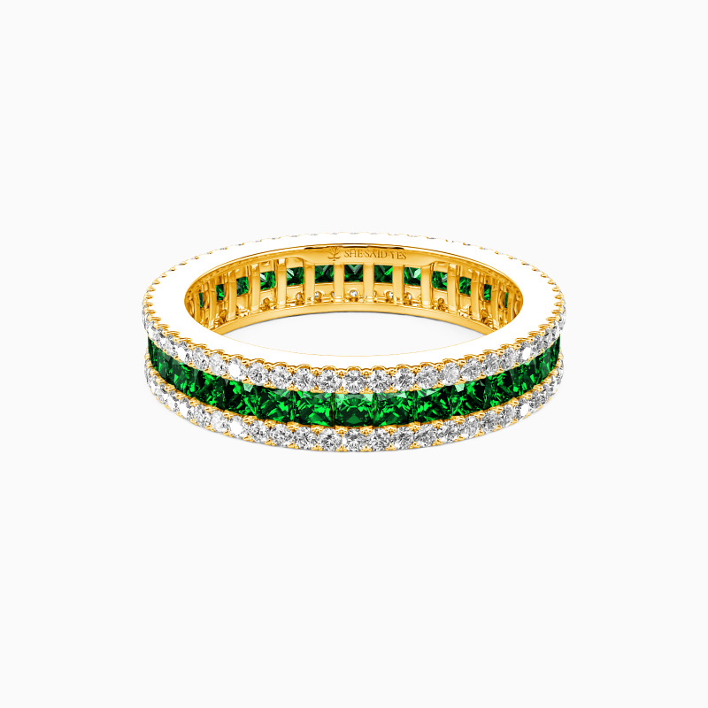 - Add other modern details. Look at designs with intricate detailing on the sides which will make the ring stunningly visual from any direction. Consider looking at more square bands than rounded ones, since they won’t pinch her fingers than as she goes about her daily life. You may also think about stacking rings, these are great if you plan to add rings for other special occasions like anniversarys. Shesaidyes also has a brilliant range of anniversary rings for her, so you can keep a style theme going, or add a stacking ring to build up a very special look.