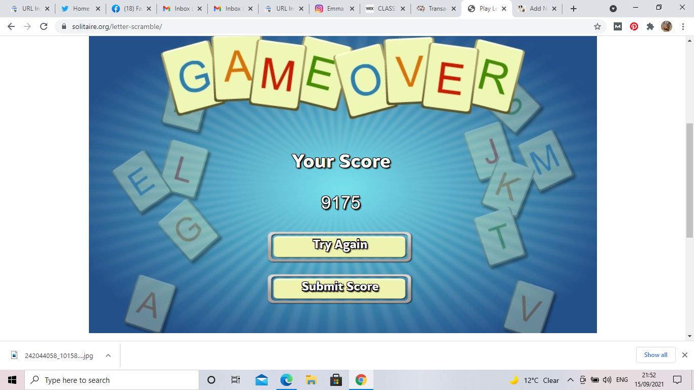 Another game I have discovered through the Solitaire website is Letter Scramble. This is a word game that takes it cues from Scrabble. Random letters appear on the screen and you grab them to create words, have an initial target of 20 within a given time frame. The letters must be three letters or more, and you get points for each word.