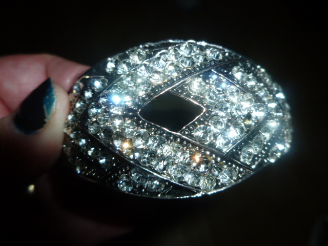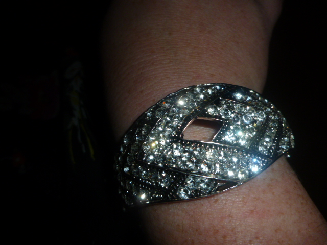 The bangle is a real statement piece, very eye catching in design, and wonderfully sparkly with it’s array of diamante stones covering the front of the piece. It has the feel of a great vintage find – something that may have belonged to a great grandmother, and yet looks great dressing up jeans, or adding sparkly to a black tuxedo suit.