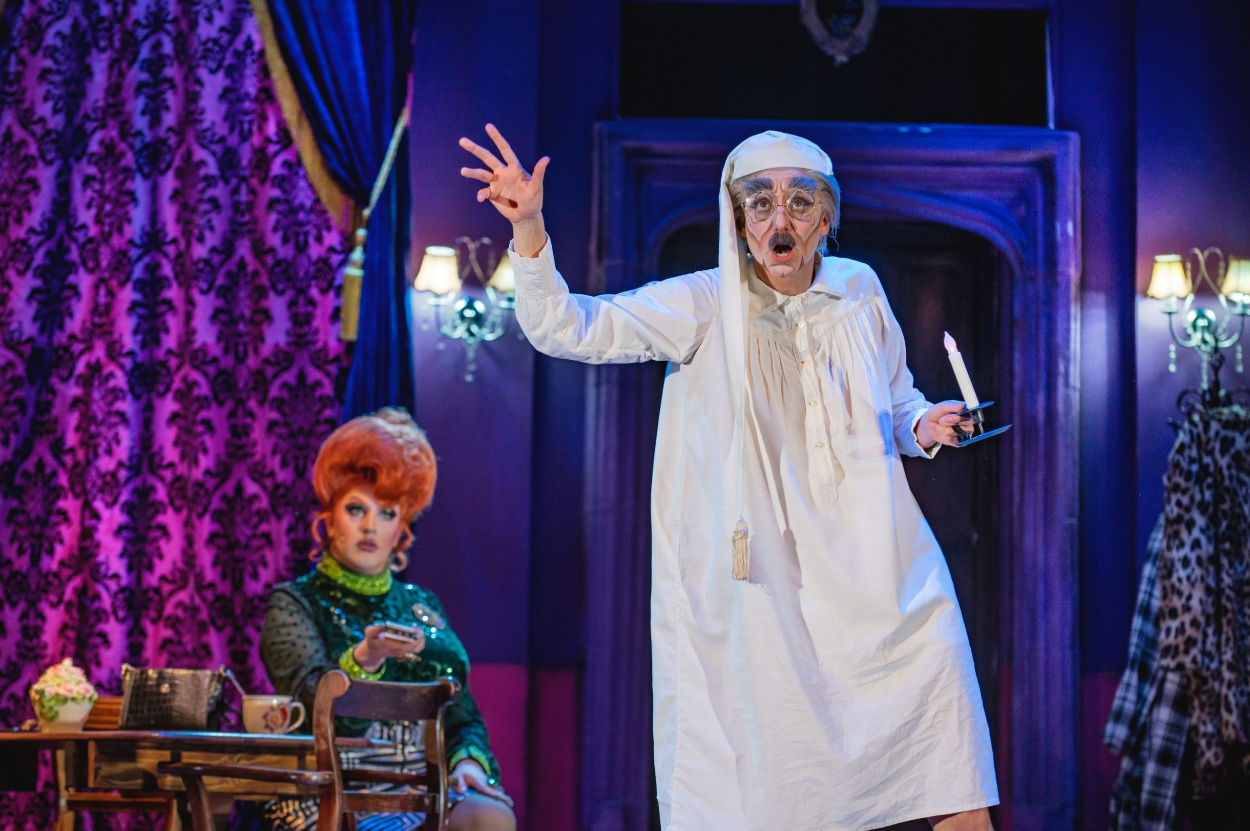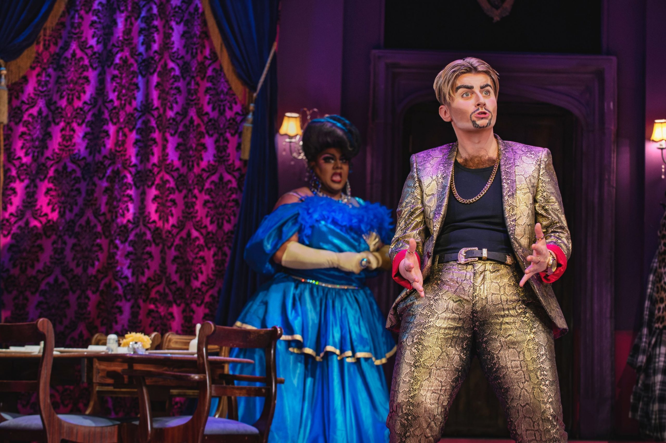 The beauty of Death Drop is its knowingness. Set in 1991, there are many bad taste jokes about everything from Charles and Diana to Jimmy Saville, as well as very bawdy scenes with rude sexual innuendo that had the Birmingham audiences laughing until they cried. The whole cast is on top form, hilariously overacting in everything from voices to mannerisms, with Richard Energy’s constant funny walks as the tory MP just one of the highlights. Shazza’s opening song to act two, complete with Stevie Nicks styling, and 80’s dry ice, is another standout moment, whilst the one liners come thick and fast, as do the tongue twisters which are a recurring theme of the show.