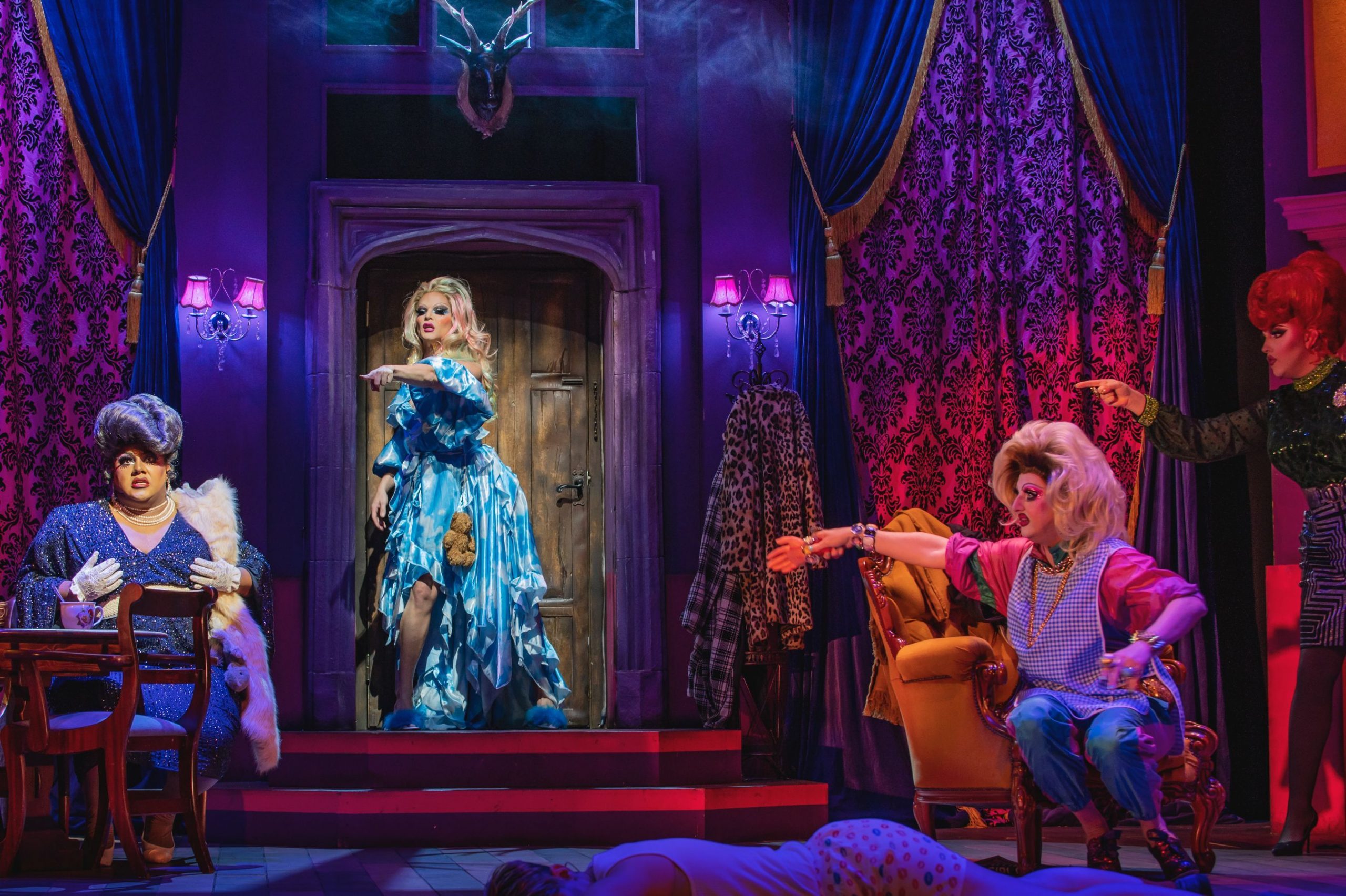 On a cold and stormy night, a group of people are invited to a party to celebrate Charles and Diana’s 10th wedding anniversary (yes, that Charles and Diana, keep up.). Their host is Lady Von Fistenburg (Vinegar Strokes), but none of the guests have ever met here before, and come to the celebration believing they might meet the royals themselves. Amongst the guests are a former pop star Shazza (Willam), a weather girl Summer Raines (Ra’Jah O’Hara), the editor of the World of the News Morgan Pierce (Karen from Finance), a tory MP Rich Whiteman (Richard Energy), and a TV producer Phil Maker (Georgia Frost). They are looked after by a trio of sisters, Blue, Brie and Spread (all named after their mother’s favourite cheeses and played in hilarious style by Holly Stars), whose cooking skills are limited to Frey Bentos pies and Vienetta. But as the storm gets worse and the guests start to wonder why they have been gathered together, the body count starts to rise. Who is the killer, and will anyone survive the night?